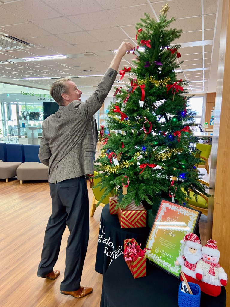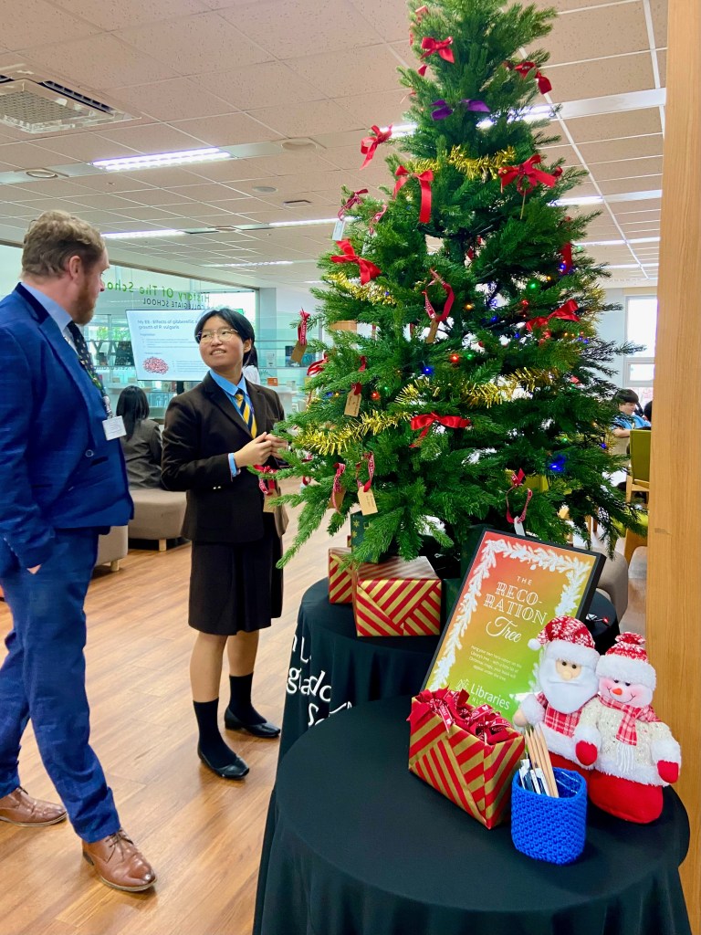The idea is simple: members of our school community write their book recommendations on festive gift tags, which become decorations on our Christmas tree. But here’s where the magic happens – these recommendations mysteriously materialise as actual books beneath the tree, creating an ever-growing collection of personally curated reads.